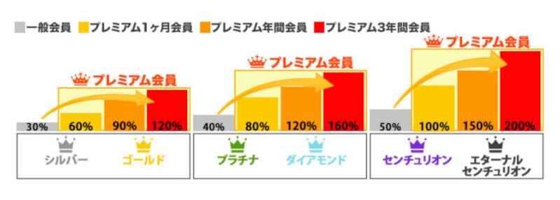 初期ランクのシルバーでは還元率が微々たるものですが、プレミアム会員になることでポイントの還元率を上げることができます。